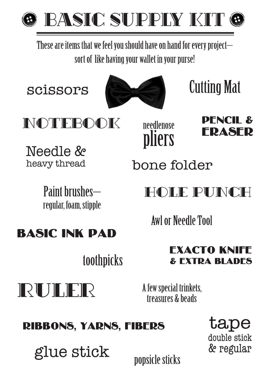 So, other than telling you to be grateful you don’t have to pack an entire trailer full of EVERYTHING, what are my recommendations for packing supplies for attending an art retreat? This the alphabetical text version (originally published as a cute graphic) of the basic supplies recommended by Art & Soul. If these items aren’t already on your class supply lists, you likely won’t regret packing them. (Pictured are the adorable tags Mindy Lacefield used as examples as she taught her fun class on Monday.)
