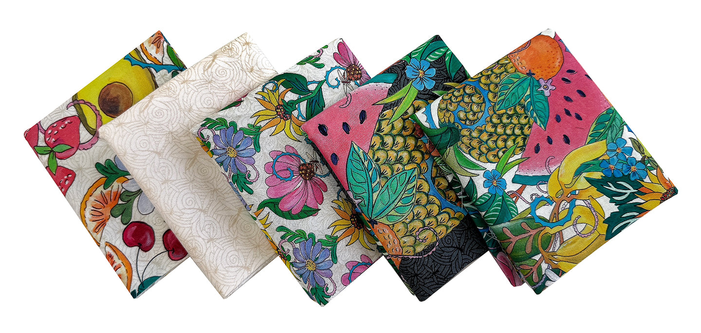 A cornucopia of fruit and flowers; an abundance of tropical delights. Beautifully designed incorporating inspirational quick ideas for the quilter, these innovative fabrics are colourful and bold, showcasing every brush stroke and rich detail of hand painted fabric.