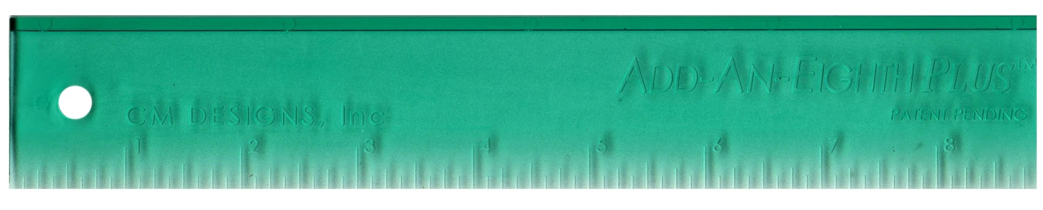 Paper Piece 25% Faster! The NEW Add-An-Eighth PLUS simplifies foundation piecing of miniatures. Ruler measures 9 in. long, 1.5 in. wide and is a translucent green color.