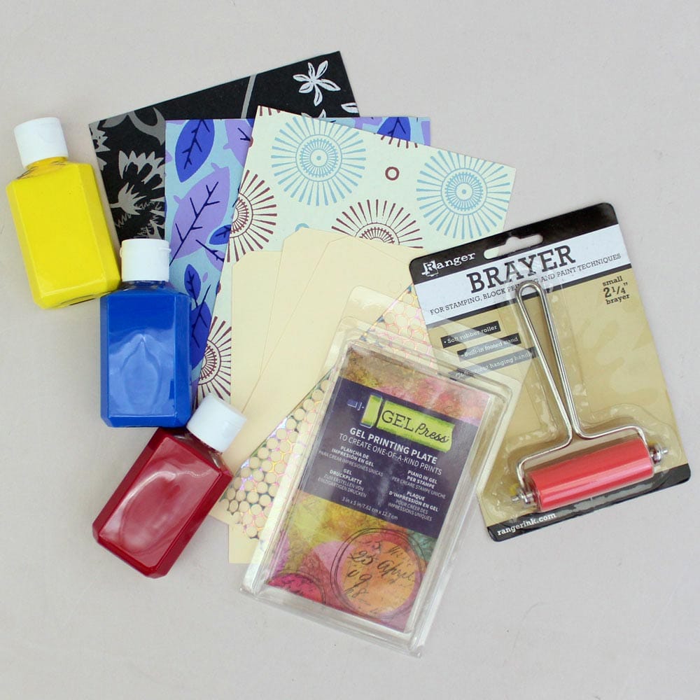 Our exclusive Monoprinting Starter Kit includes a 3 in. x 5 in. Gel Press gel printing plate, a 2¼ in. soft rubber brayer, 2 oz. sample bottles in red, blue and yellow of Artistic Artifacts Fluid Textile paint, plus a piece of sequin waste for texture — even a manila tags and 100% cotton rag paper block printed in India to print on! The durable Gel Press is easy to use and clean, and stores at room temperature — this size is perfect for 2½ x 3½ in. Artist Trading Cards (ATCs), greeting cards, art journals and much more. Our artist quality, highly pigmented easy flow Fluid Textile Paints are perfect for use in monoprinting — you can mix a wide range of hues with these three primary colors. Make stunning prints for use in your artwork: mixed media, collage, scrapbooking, home Décor and more!