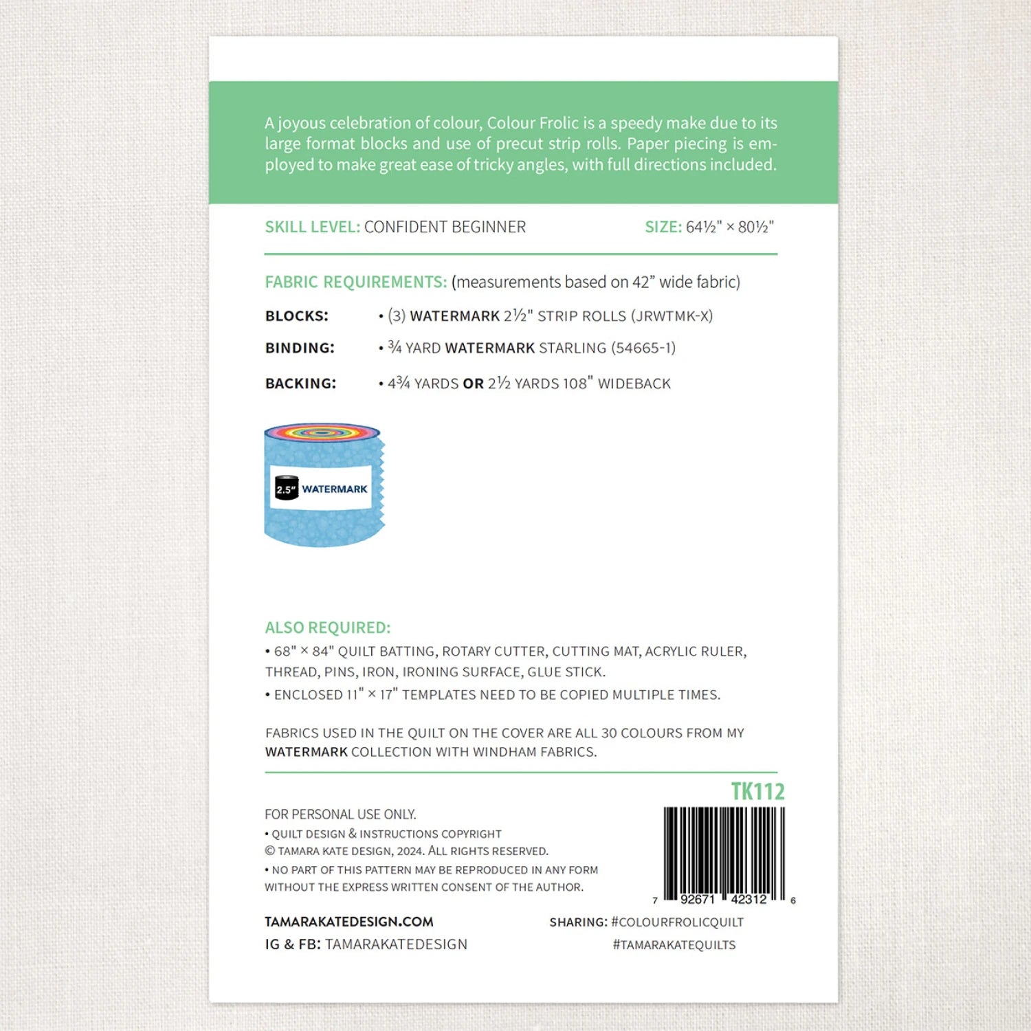 A joyous celebration of color, Colour Frolic by Tamara Kate Design is a speedy make due to its large format blocks and use of precut strip rolls. Basic paper piecing is employed to make great ease of tricky angles, with full instructions included. Finished Quilt Size: 64 in. x 80 in. A perfect pattern for jelly rolls! Includes: Instructions (including FPP instructions), templates (that need to be photocopied on 11 in. x 17 in. paper), diagrams, coloring sheet, fabric requirement list. SKILL LEVEL: Confident Beginner.