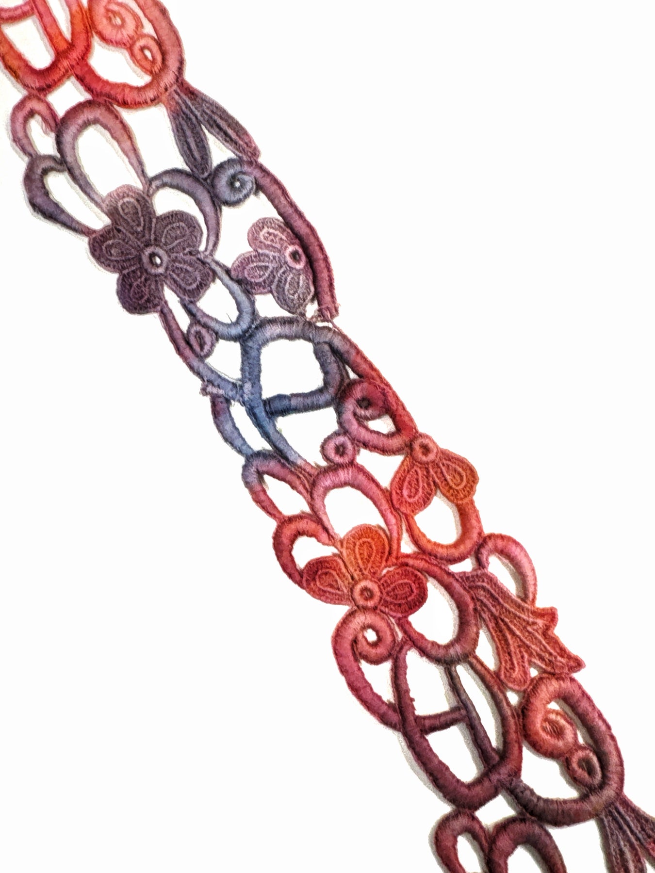 A hand-dyed rayon trim with a multicolor floral motif, offering visual interest and layered texture.