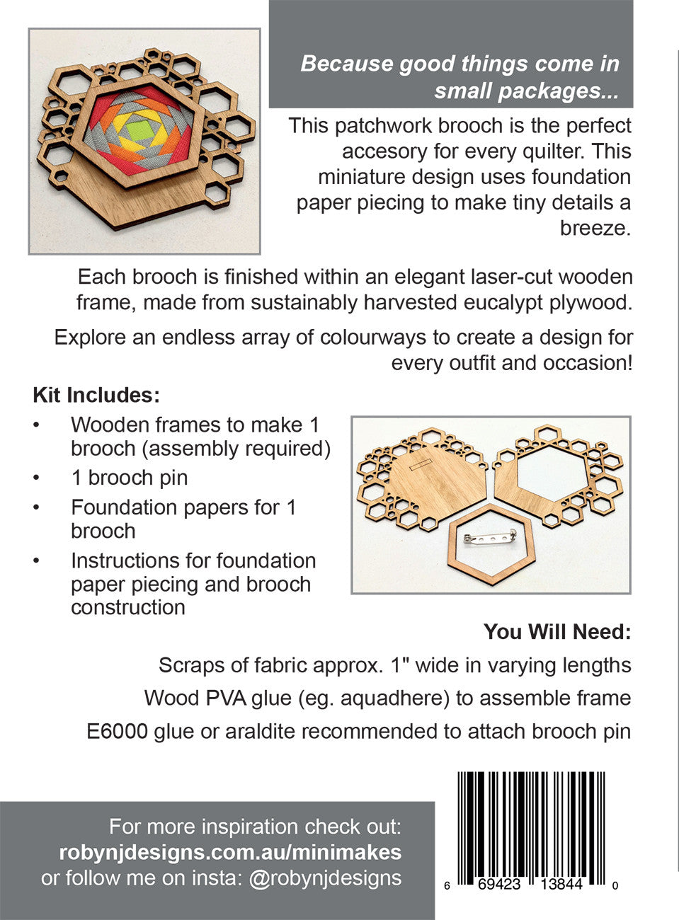 This patchwork brooch by Robyn J Designs is the perfect accessory for every quilter. The miniature design uses foundation paper piecing to make tiny details a breeze. Each brooch is finished within an elegant laser-cut wooden frame, made from sustainably harvested eucalypt plywood. Explore an endless array of colorways to create one for every outfit and occasion! Finished size: 3 in. x 3 in. Fabric not included (kit requires scraps of fabric approx. 1 in. wide in varying lengths).