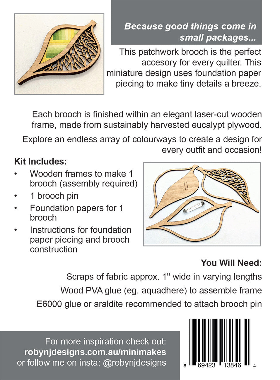 This patchwork brooch by Robyn J Designs is the perfect accessory for every quilter. The miniature design uses foundation paper piecing to make tiny details a breeze. Each brooch is finished within an elegant laser-cut wooden frame, made from sustainably harvested eucalypt plywood. Explore an endless array of colorways to create one for every outfit and occasion! Finished size: 2.25 in. x 4 in. Fabric not included (kit requires scraps of fabric approx. 1 in. wide in varying lengths).