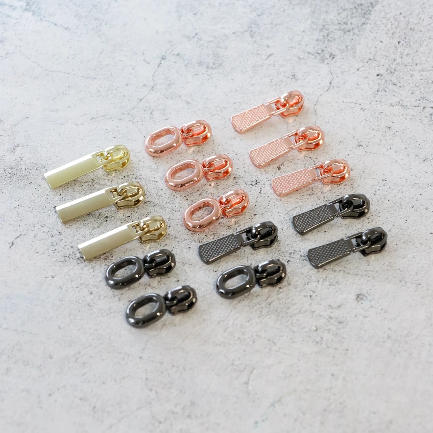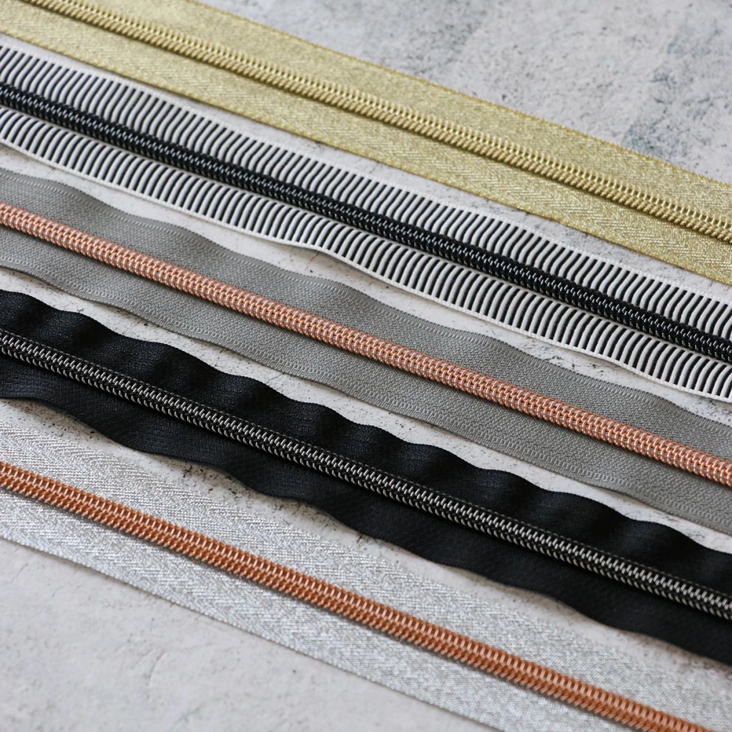 Can't decide on which zippers and pulls to choose? Sally Tomato has created community top-picks and dreamy zipper bundles to complete your collection! You’ll receive one yard each of five different zipper tapes, size #5 Zippers. Your pack also includes 15 total zipper pulls. Sally Tomato’s premium Zippers by the Yard boast sturdy nylon teeth that ensure a professional finish without the worry of breaking needles, providing a reliable and resilient solution for your sewing projects.