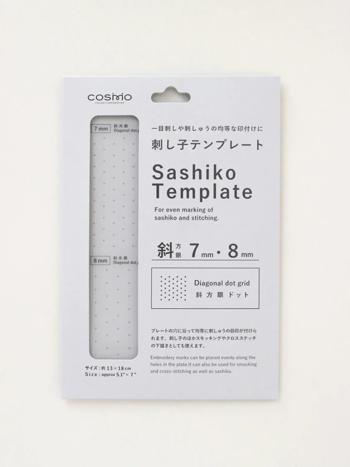 This versatile Sashiko template features a diagonal dot grid pattern, perfect for both traditional and modern stitching projects. With two distinct grid sizes, 7mm and 8mm, this template allows for precise and varied designs. The light blue background with neatly arranged black dots offers a clear guide for your needlework, ensuring accuracy in every stitch. Ideal for quilters, embroiderers, and anyone interested in the art of Sashiko, this tool enhances your ability to create intricate patterns with ease.