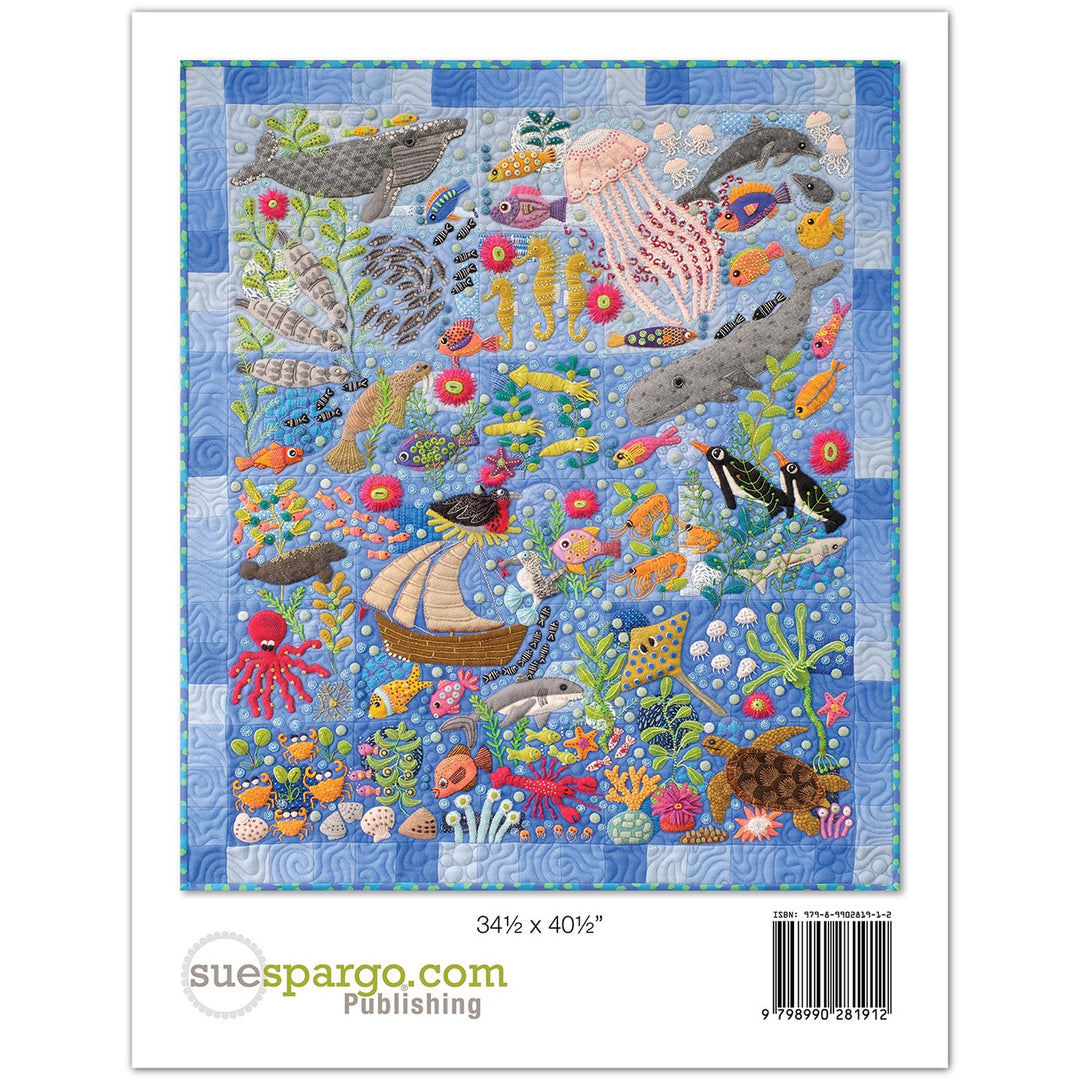 [Softcover, 192 pages] Pattern book for Sue Spargo’s Trade Winds quilt, finishes to 34.5 in. x 40.5 in. Learn Wool appliqué, layering and embroidery quilt/wall hanging. Sail out into the great unknown with Sue! For years, Sue has filled her journal with folktales and drawings inspired by the ocean on her many travels across the globe. These ocean inspired creations came to fruition in the spectacular Trade Winds Quilt. Trade Winds is not only a vehicle for creativity and craft but an opportunity to dive deeper. Come and uncover the wonders of the ocean’s flora and fauna and how our ever-changing world is impacting the health of our beloved waters. Detailed instructions, clear pattern and stitch diagrams, and the opportunity to learn new techniques such as wool appliqué, layering, cotton appliqué, embroidery, dimensional embroidery, and texture creation made Trade Winds an ideal Block of the Month program for Sue, and now you can create your own! Sue Spargo’s book Creative Stitching (sold separately) is referenced through and necessary for embroidery stitch instruction.