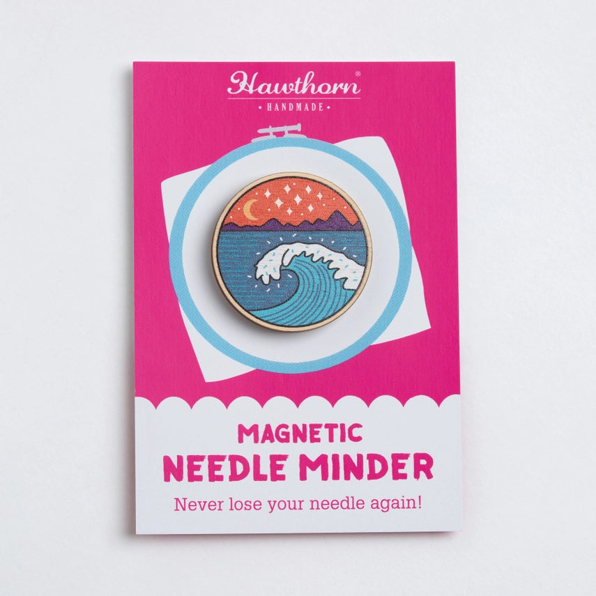 Never lose your needle again! This fun yet practical wave and mountains scene wooden needle minder is the perfect accessory to any stitching project and makes a wonderful gift for all crafters. The magnet will easily hold multiple sewing needles and pins, and even small embroidery scissors and crochet hooks! Made in the UK from FSC certified 4mm thick maple veneered wood and super strong neodymium magnets, the needle minder measures approximately 3.5cm long. Each needle minder comes on a beautiful backing card and is packaged in a clear cello bag with a euroslot hanger for easy display. These also double as wonderful magnetic pins to wear, fridge magnets, pattern magnets and more!