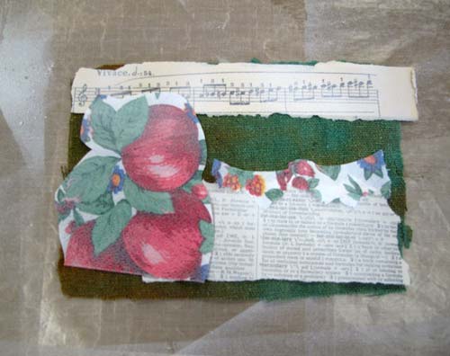 I decided to spray larger pieces of the napkin, dictionary, and music paper, then cut and tear in smaller sizes to collage with, creating a small, postcard size collage.