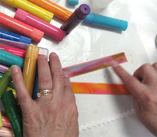 Above, stroke different colors of Gelatos directly on ribbon and blend with your finger. Mist with water if desired for blending. As noted in Part 1 of our article, you can also apply just a few strokes of Gelatos onto your non-stick ironing and craft sheet (or freezer paper) and mist that with water to create a puddle of beautiful dye-like color that can be applied with a brush, by sponging it on, or by dipping the fabric in, etc. Vary the intensity of your color by altering the amount of water added.