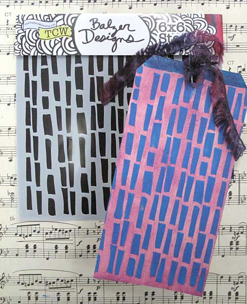 Below right, tag washed with Gelatos, topped with modeling paste applied through a TCW stencil. The white modeling paste was mixed with Gelatos to tint it blue prior to application.