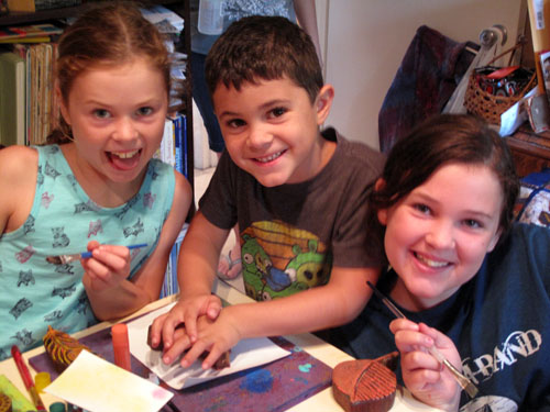 Our mission, as accepted, was to play with wooden printing blocks (pictured above), fabric, and Gelatos. My team members are Layla, Evan and Celia (pictured below, left to right).