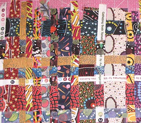 First I created colored backgrounds with paint and stencils, as I wanted a clearer background, consisting of one color and pattern. While the cards were drying I took scraps of Australian Aborigine designed fabrics and wove them together in a plain weave (over under one fabric, over under the next). Below is the first row: