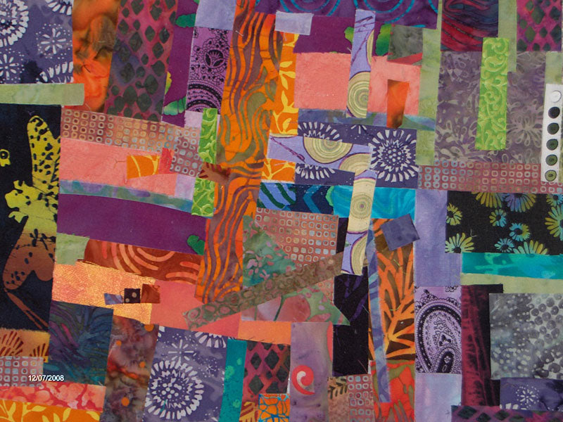 I love to create collaged fabrics. It is relaxing to me, and I have many uses for it, whether cutting it into small bits for my pins or using it to build an art quilt. It’s a great process when you want to be creative but aren’t feeling the pull of a specific project, or if you only have a short period of time to work. To begin my collaged fabrics, I pick one of the several drawers in my studio that hold scraps of fabric sorted by color and take it to my work surface or ironing board. Next I cut a piece of Steam-A-Seam 2 approximately 12 in. 14 in. (Artistic Artifacts sells this by the yard, and Lite Steam-A-Seam 2 is available in a package of five 9 in. x 12 in. sheets.) These are double stick fusible webs, heat activated and pressure sensitive. The fusible is sticky and repositionable, so you can “play” with your design before permanently ironing. I love using Steam-A-Seam 2 for this technique since it holds the fabric scraps in place. I peel one piece of the protective paper off and set it aside. Place the Steam-A-Seam 2 on your work surface, sticky side up. Begin by pulling scraps from your stash, iron them, (honestly, I guess you don’t really have to iron them!) place them on the Steam-A-Seam 2. You can cut them smaller or into shapes as you like. I start my fabric collage in the middle and work out towards the edges. You can begin anywhere you want!