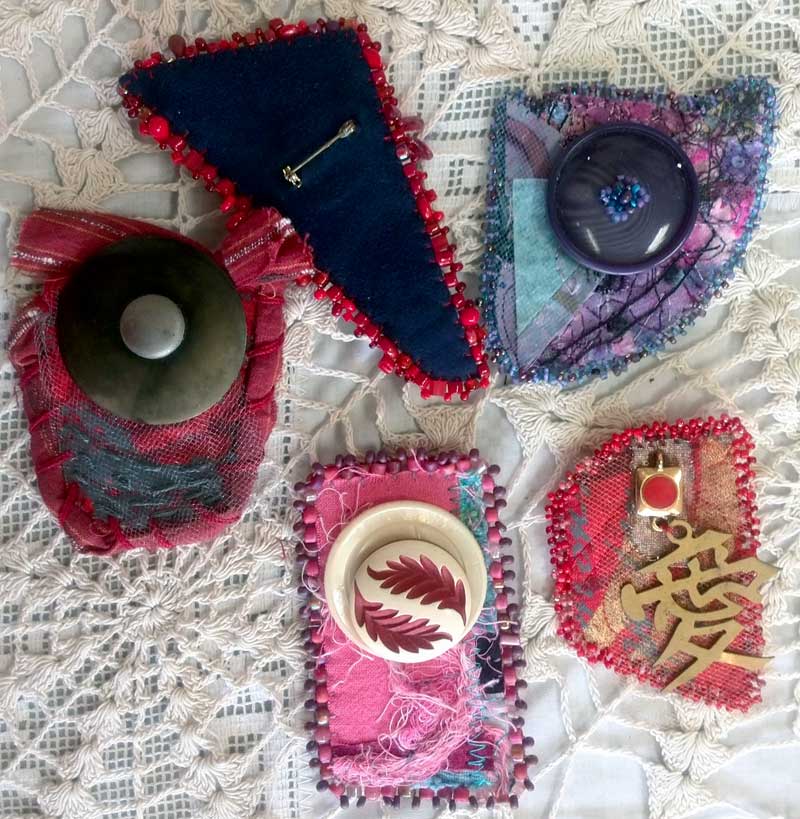 To make my fabric pins, I pull out my vintage buttons, beads, laces, etc., once the free motion stage is finished. I cut the collaged fabric sheet into various shapes and pieces to begin my pins, then start the layering and embellishing steps.