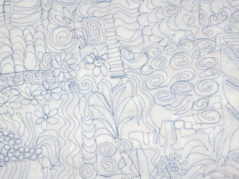 Above you can see the reverse of one of my fabric collage pieces that has been free-motioned quilted. The white of the Peltex stabilizer I used is visible shows off my free motion doodling. Since I was going to cut this piece up and finish the back in additional steps, there was no need to have a visible backing fabric in place.