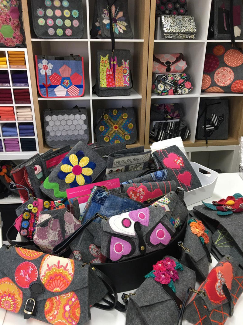 Above, a glimpse of our presentation setup, with Aster & Anne packaged kits, selections of our wide range of fabrics, and one of our Inspiration Packs, bundles of hand dyed fabrics and found textiles that are perfect for fiber collage. All Aster & Anne precut wool felt pieces are sent unassembled so that you can work on them flat, and they are very easy to stitch through, whether by hand or by machine.