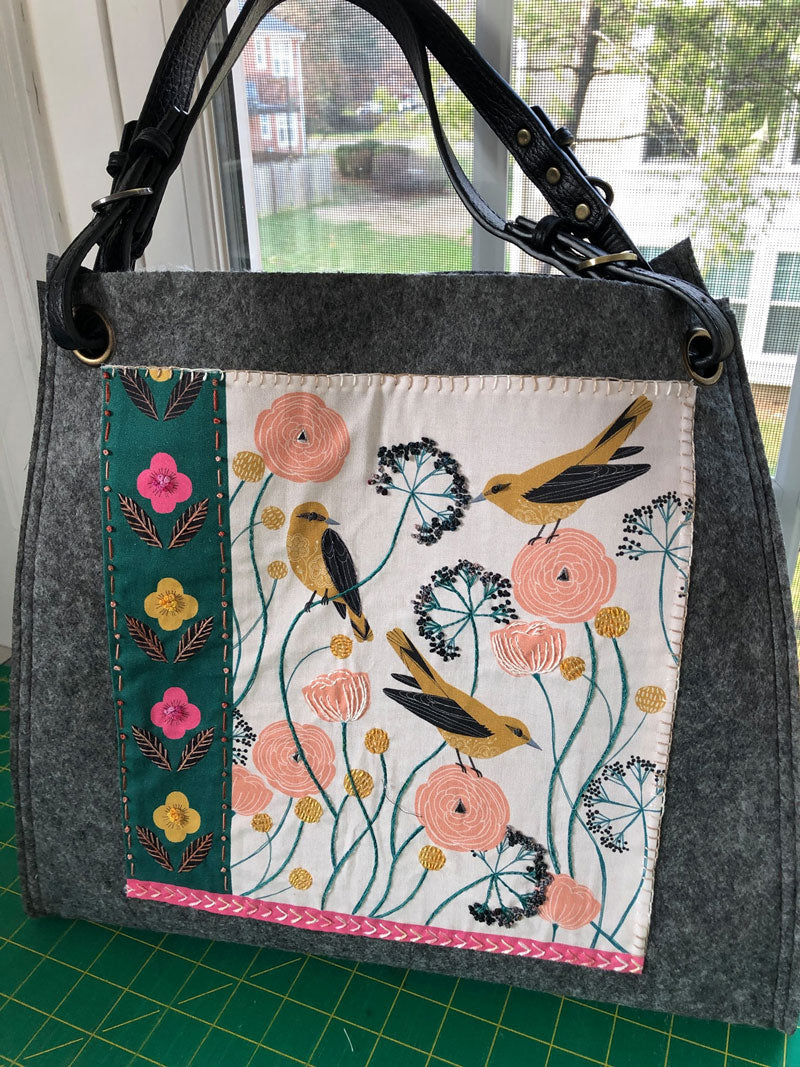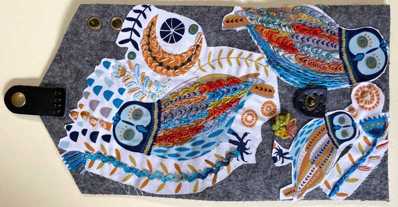 Chris showed her completed Anna tote, embellished with with a piece of the Aviary Panel from Dashwood Studio that was stitched and embellished with hand emberoidery using Eleganza perle cotton, available in three weights.