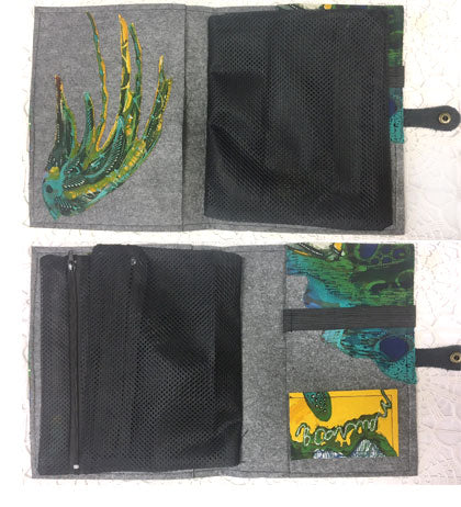 Look at this wonderful Book Cover/Project Bag by Chris Vinh! She fused on a fish cut from a batik panel by Bambang Dharmo, first laying out a piece of hand dyed cheesecloth. She machine appliquéd and quilted it all, then accented with hand-stitching and embroidery. She used other portions of the panel to embellish the interior as seen here.